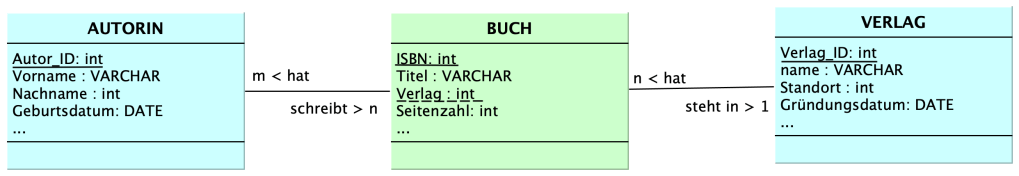 Wir sehen, dass BUCH zu VERLAG eine 1:n Beziehung hat. Da ein Buch (besonders Fachbücher) aber oft mehr als eine*n Autor*In haben kann, bildet sich hier eine n:m Beziehung.