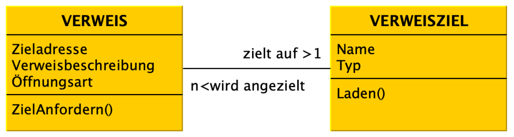 Um diese Beziehung darzustellen brauchen wir zwei Klassen. Eine Klasse für den Verweis an sich, der hauptsächlich zeigt, wohin man kommt, wohinter der Verweis versteckt ist und beispielsweise ob der Verweis in einem neuen Fenster geöffnet werden soll. Die zweite Klasse kümmert sich um alle möglichen Verweisziele. Wir können nicht nur Webseiten, sondern beispielsweise auch alle anderen Dateien als Download hinter einem Verweis verbergen.