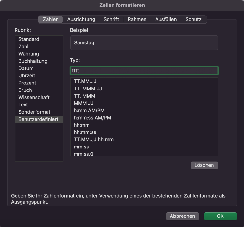 Um beispielsweise Wochentage richtig (und nicht als Zahl) formatiert zu bekommen, muss die richtige Zellformatierung angegeben werden. Durch Rechtsklick auf eine Zelle kann man unter Zellen formatieren den Punkt Benutzerdefiniert nutzen. Die Abkürzung tttt steht hier für den ausgeschriebenen Wochentag.