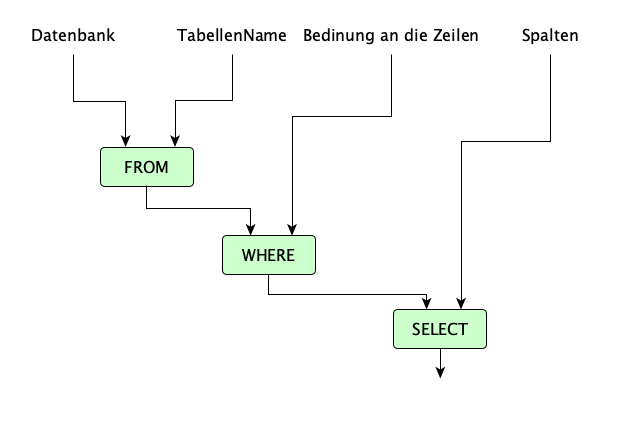 Vom Datenfluss betrachtet, muss zuerst die Tabelle, dann die Zeilen und am Schluss die Spalten ausgewählt werden. Die Spalten werden dabei zuletzt entfernt, da man so die Zeilen auch nach Attributen aussortieren kann, die im Ergebnis nicht interessant sind.