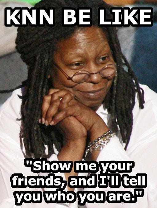Der kNN Algorithmus entscheidet, zu welchem Cluster man gehört auf der Basis der nächsten Nachbarn. Im Meme steckt die Aussage, dass unsere Freunde und diejenigen, die uns umgeben, etwas über uns selbst aussagen. Der kNN ist hier ähnlich, da er auch über die Nähe zu anderen Datenpunkten etwas über den neuen Datenpunkt aussagt. Insgesamt sehr passend, um den Kerngedanken des kNN im Gedächtnis zu behalten.