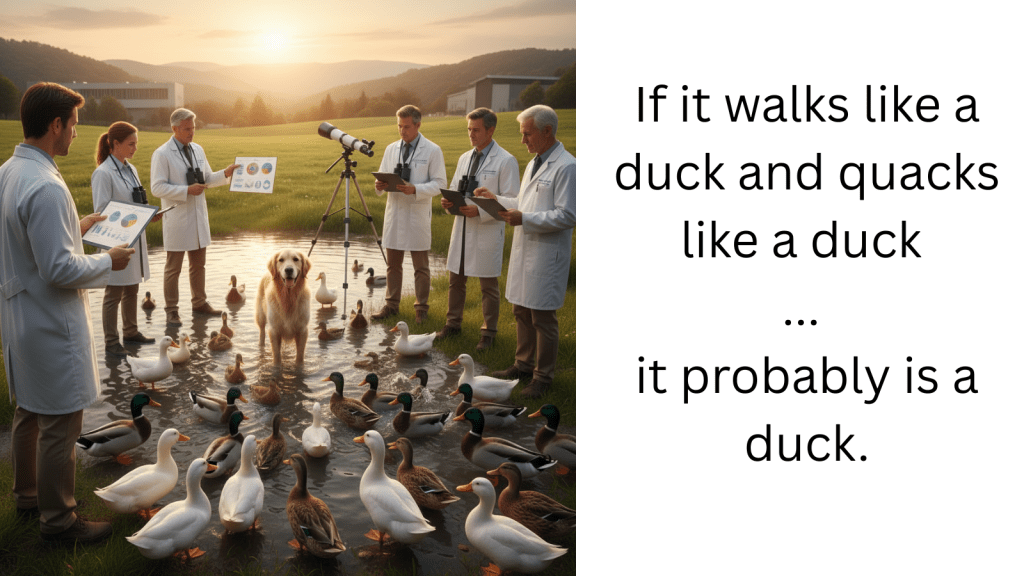 Der kNN Algorithmus analysiert Datenpunkte anhand der Nähe zu anderen Datenpunkten. In diesem Meme geht es darum, wenn zwei Eigenschaften ähnlich sind, dass eine Schlussfolgerung getroffen wird. Dabei stellt sich im Bild aber heraus, dass das Tier in der Mitte gar keine Ente ist. Somit hinterfragt das Meme, ob die Ähnlichkeit in manchen Eigenschaften eigentlich reicht, um eine Ähnlichkeit zu anderen Datenpunkten herzustellen.